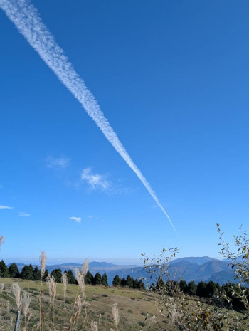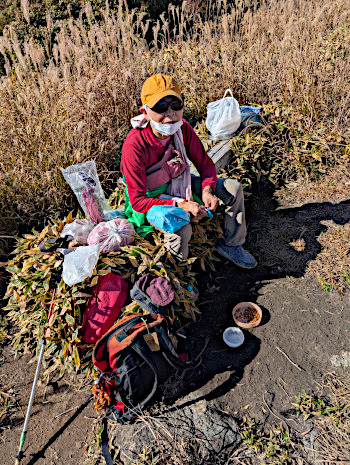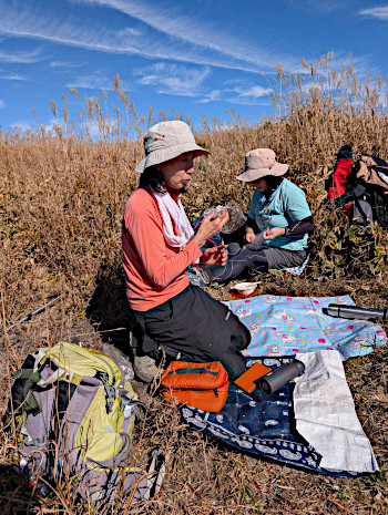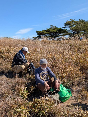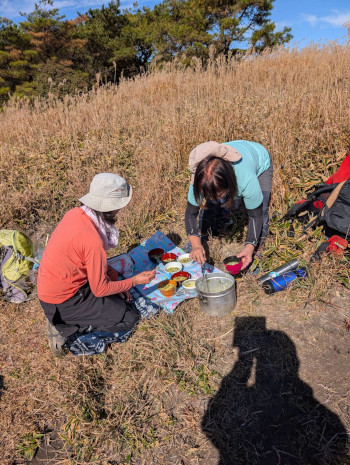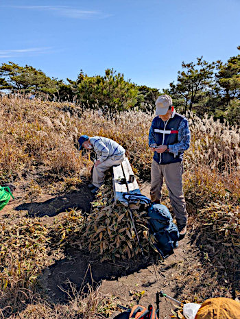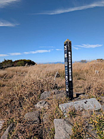2ケ月前の下見のときは、登山道が長く寒く、昼食は下山途中にある避難小屋で食べました。9月がこんな調子で、11月の例会日には、どんな寒さになるのかと心配していました。幸い、満天の青空で山頂の気温は19℃と暖かく、阿蘇山や九重連峰の山々眺めながらの楽しい昼食となりました。